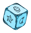This features a blue cube with various symbols and drawings on it. There are three stars, one in the middle of the cube and two smaller ones at the top left corner. Additionally, there is an apple symbol located near the center of the cube, as well as a fish symbol towards the right side. The overall design gives off a playful and creative vibe.