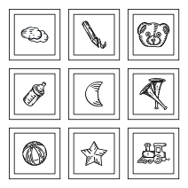 Tags: baby, baby bottle, ballon, cloud, horn, moon, outline, pencil, star, teddy bear, toy, train