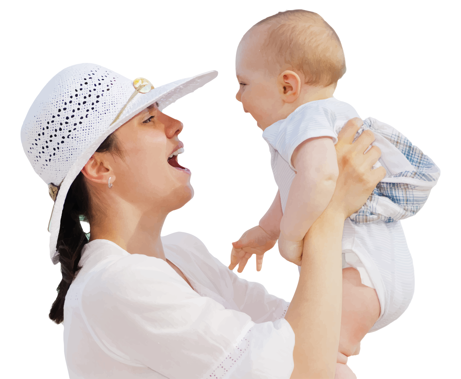 This features a woman wearing a white hat and holding a baby in her arms. She is smiling as she looks down at the infant, who appears to be sleeping peacefully. The woman's outfit includes a shirt with a collar, which adds an elegant touch to the scene. The baby is positioned close to the woman's chest, and it seems like they are enjoying each other's company in this tender moment.