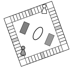 This features a black and white drawing of a board game, with the main focus on a square that has an oval in the middle. There are two people standing next to each other within this square, one closer to the left side and the other nearer to the right side. The scene appears to be set up as if they are playing a game together. In addition to the main square with the oval, there are several smaller squares surrounding it. Some of these squares have chairs placed within them, indicating that this board game might involve seating arrangements or specific areas for players to sit during the gameplay. The overall composition of the image suggests a fun and engaging atmosphere as people enjoy playing together in this imaginative setting.