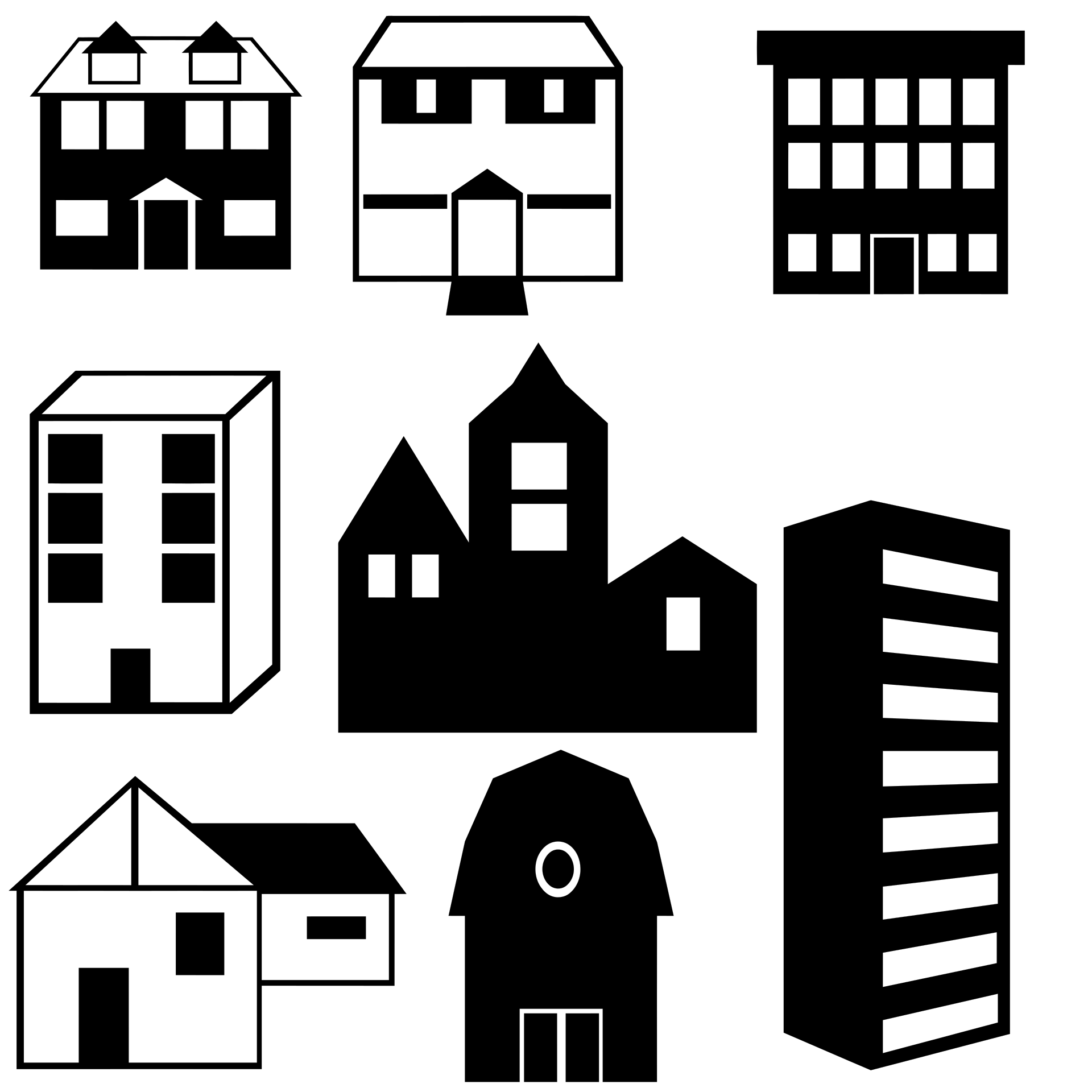 This features a collection of black and white illustrations of various buildings, including houses and office buildings. There are six different buildings in total, each with unique architectural designs. One of the buildings is a house with a distinctive round window, while another has an interesting clock tower design. Additionally, there's a tall building that resembles a skyscraper, which stands out among the other structures. The illustrations are arranged in a square formation, creating a visually appealing and organized presentation of these architectural designs.
