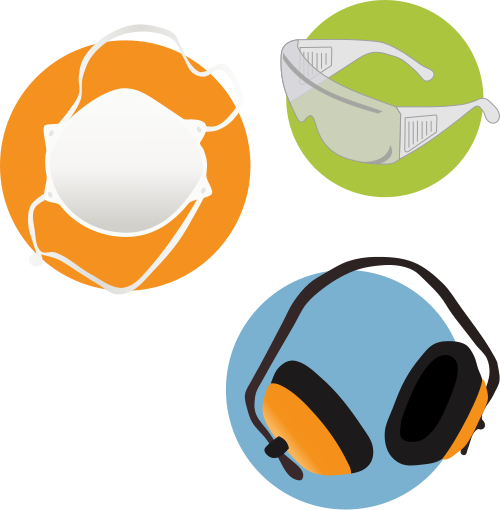 This features four different colored circles, each representing a safety item. In the top left circle, there is a white mask with a blue border. The second circle in the top right corner displays a pair of orange goggles. The third circle on the bottom left showcases a green pair of glasses, and finally, the fourth circle at the top center displays a blue pair of safety glasses. These images emphasize the importance of wearing appropriate protective equipment for various tasks or environments to ensure safety and prevent potential hazards.