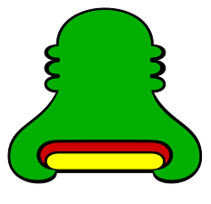 This features a green and yellow cartoon-like character with an open mouth. It appears to be a colorful, whimsical design that could potentially represent a character from a children's show or game. The character is depicted in various colors, including green, yellow, red, and orange, which adds to its playful appearance.
