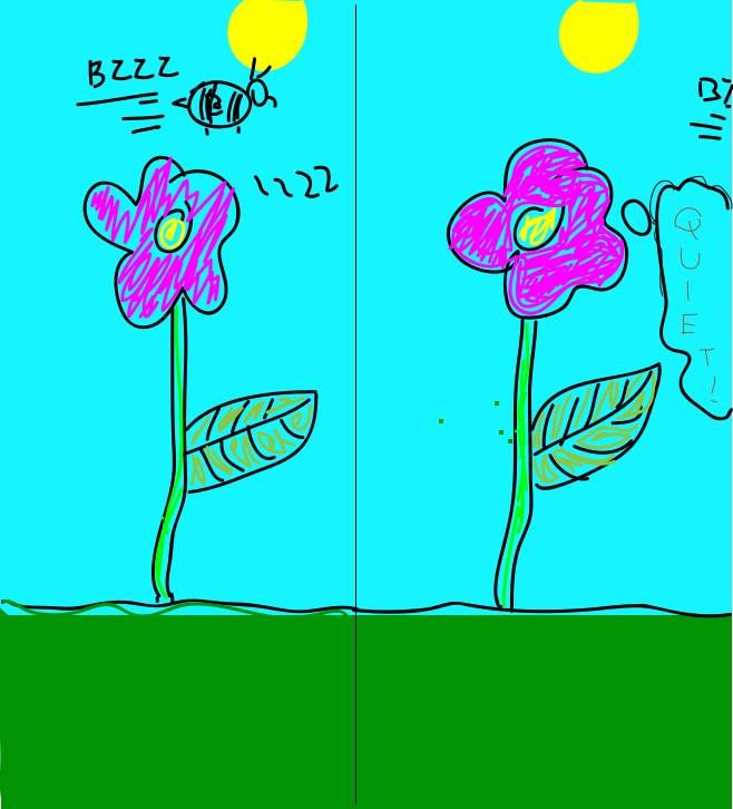 This features a pair of cartoon flowers with the words "Bzzz" and "Sleeping" written above them. Each flower has a speech bubble coming out of it, with one saying "Bzzz" and the other saying "Sleeping." The flowers are situated in a green field, giving the impression that they are growing in nature.