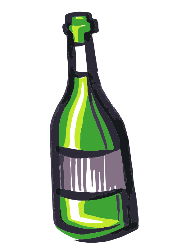 This features a green bottle with black stripes, which is likely a wine or champagne bottle. It has an unusual shape and is depicted in a cartoon-like style, giving it a unique appearance. The bottle appears to be empty, as there is no cap on top of it. This artistic representation of the bottle adds a creative touch to its presentation.