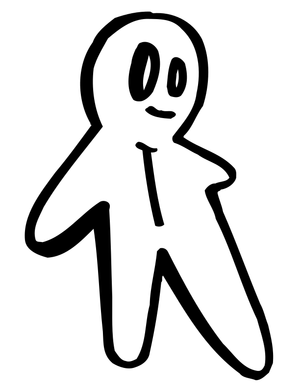 This features a black and white drawing of a gingerbread man. He is standing with his arms at his sides, giving the impression that he's posing for a picture. The gingerbread man has a smiling face, adding a friendly touch to the overall appearance. The simplicity of the drawing highlights the focus on the main subject, making it an appealing and eye-catching image.