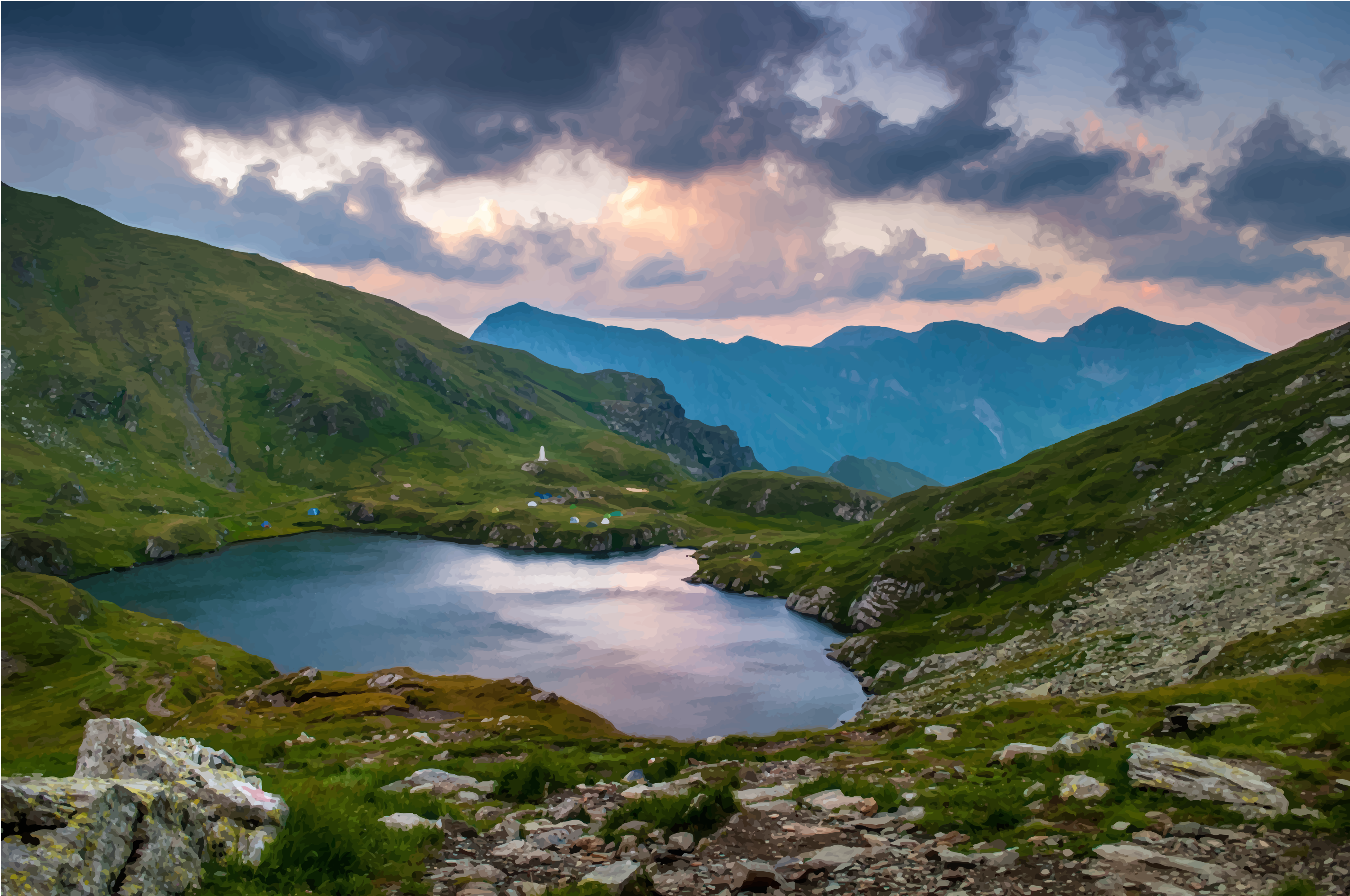 This features a serene mountain lake surrounded by lush green hills. The water is calm and reflects the beauty of the landscape. In the distance, there are mountains that add to the picturesque scenery. A few houses can be seen in the area, likely providing a peaceful retreat for those who visit this location. The overall atmosphere suggests a tranquil getaway from the hustle and bustle of everyday life.