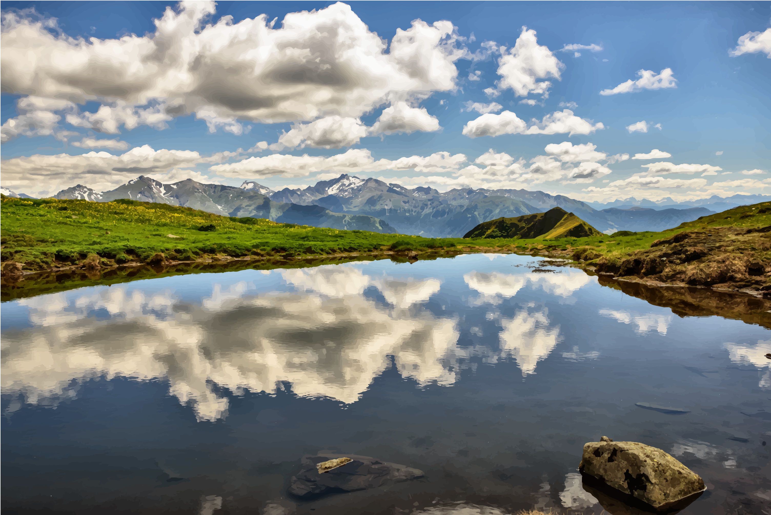 This features a serene mountain lake surrounded by lush greenery. The water appears to be calm and reflects the beauty of the landscape, creating an almost perfect mirror effect. In this picturesque scene, there are several mountains visible in the background, adding to the majestic atmosphere. A few rocks can also be seen near the edge of the lake, further enhancing the natural setting. The overall composition of the image is a harmonious blend of water, mountains, and rock formations, creating an idyllic landscape for nature enthusiasts to enjoy.