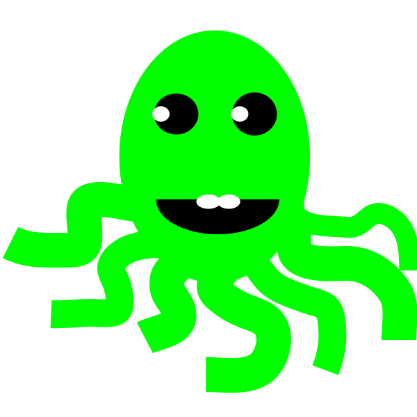 This features a green octopus with a smile on its face. It has seven tentacles visible, and the color of the octopus is bright and vibrant. The octopus's expression appears to be friendly and inviting, making it an appealing character for various purposes such as children's books or educational materials. The design of the octopus is simple yet effective in conveying its playful nature.