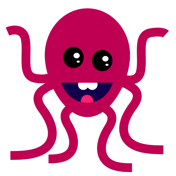 This features a red cartoon octopus with big eyes and a smile on its face. It has six visible tentacles, each one extending outwards from the body of the octopus. The octopus's facial expression is cheerful and friendly, making it an appealing character for children or anyone who enjoys cute animal illustrations.