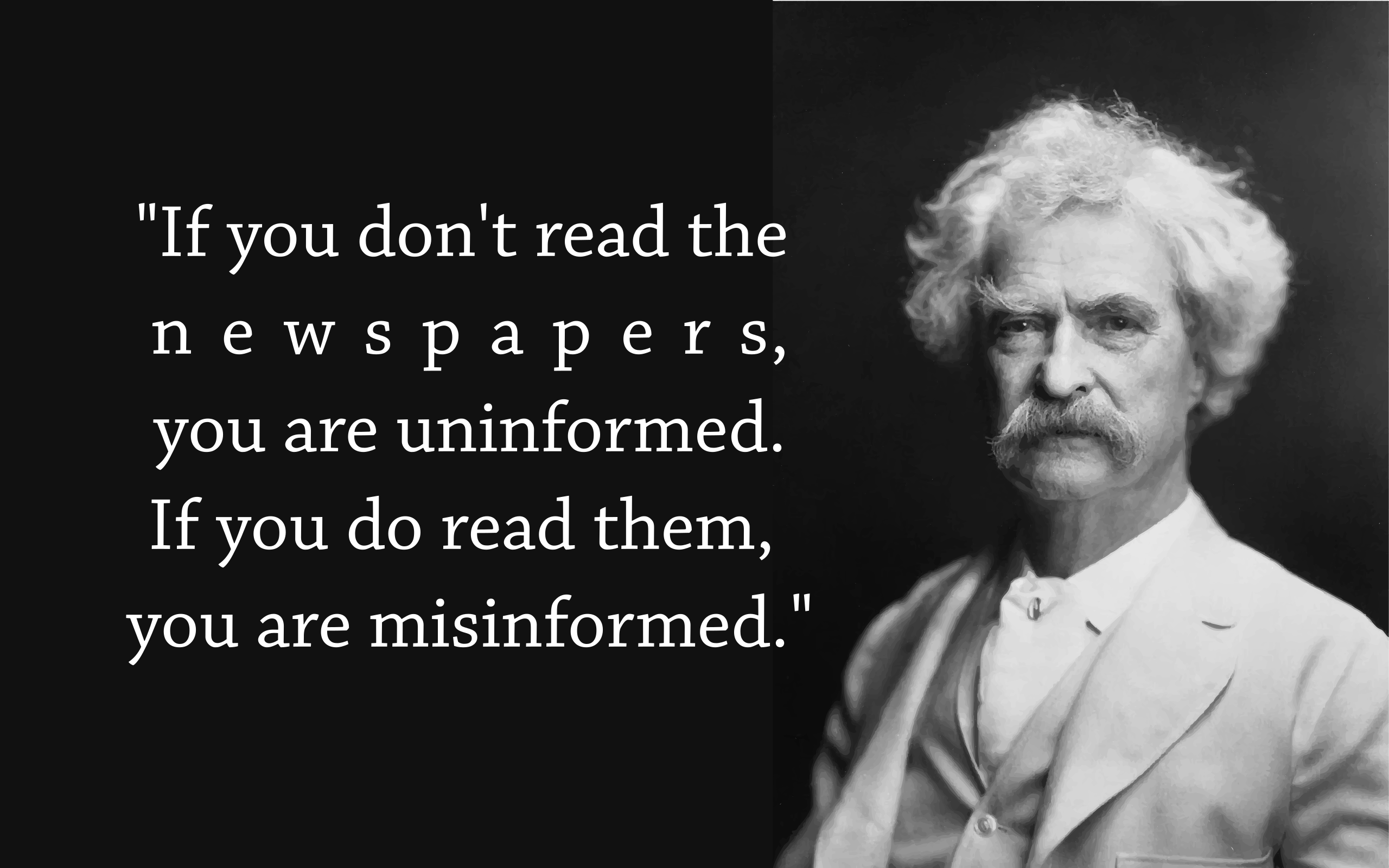 This features a man with a mustache and beard, wearing a suit and tie. He is looking at the camera while holding a newspaper in his hand. The quote displayed above him reads "If you don't read the newspapers, you are uninformed. If you do read them, you are misinformed." This suggests that the man might be a well-read individual who understands the importance of staying informed through various sources of information. The image is in black and white, which adds to its classic and timeless appearance.