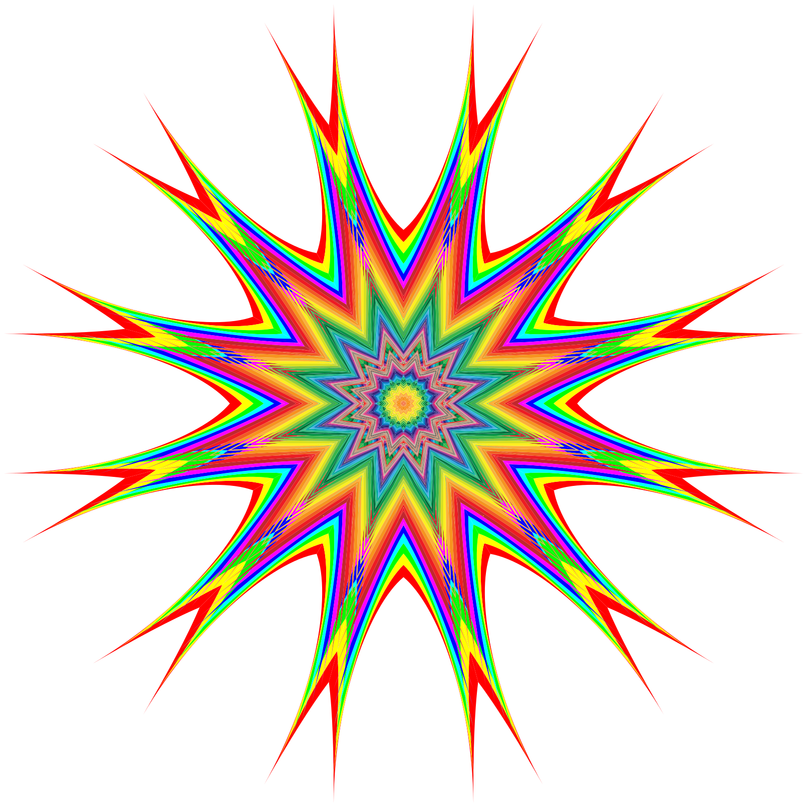 This features a large, colorful star with twelve edges that are splitting in two. This vibrant and eye-catching design is reminiscent of a kaleidoscope or a mandala, as it consists of various colors arranged in an intricate pattern. The star's shape is circular, making it the focal point of the image. The combination of different colors creates a visually striking effect that can be appreciated by viewers who enjoy art and design.