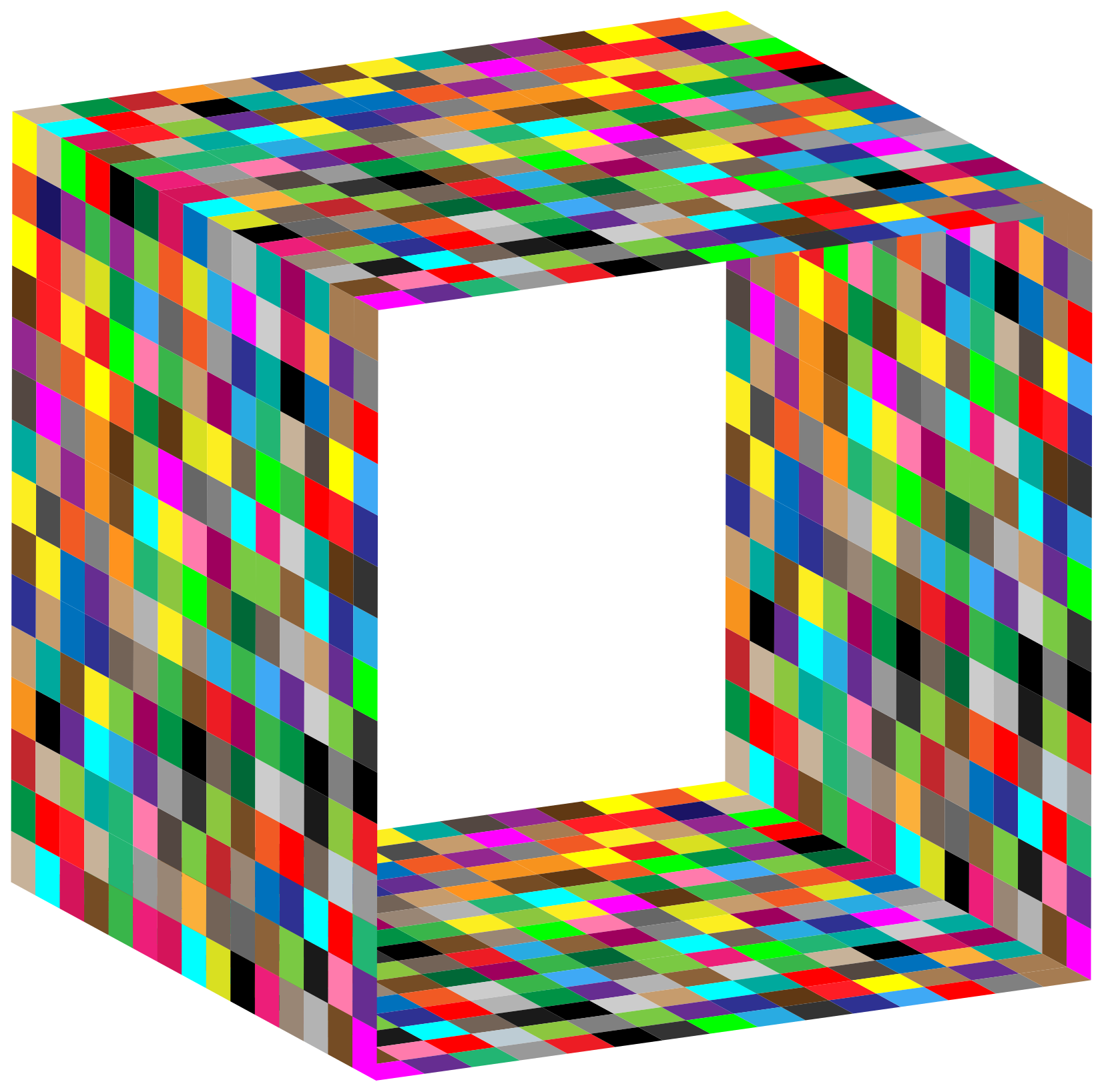 This features a three-dimensional, colorful cube with a hole in the middle. It is made up of various colored squares that are arranged to create an intricate pattern. The colors used for this design include red, blue, green, yellow, and orange. The cube appears to be a part of a larger structure or art piece, as it is displayed prominently within the image. This unique design showcases creativity and attention to detail in its construction.