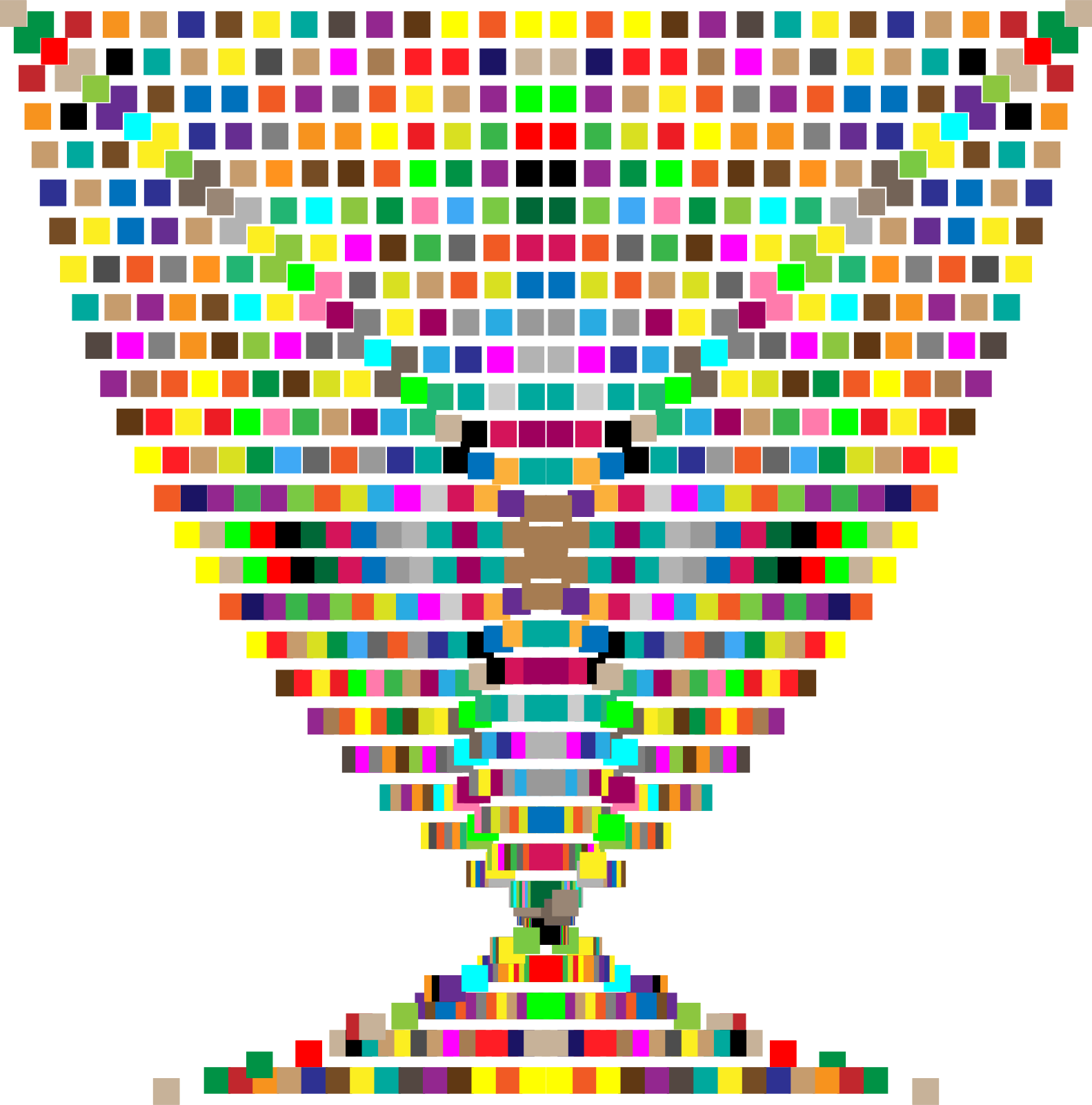 This features a large, colorful, and intricate design of a vase made up of many different colored squares. These squares are arranged in such a way that they create the illusion of a three-dimensional structure, giving the impression of a hollowed out vase. The colors used in this artwork are diverse, with each square featuring a unique color combination. This creative design showcases an interesting and visually appealing representation of a vase made up of many different colored squares.