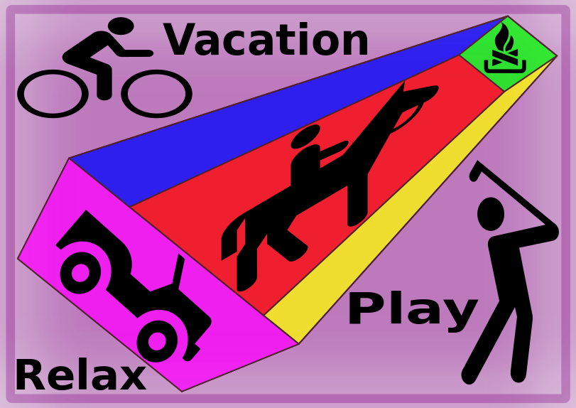 This is a colorful poster that features various activities associated with vacation. There are stick figures depicted engaging in different pastimes, such as horseback riding and playing golf. A person on a bicycle can also be seen, indicating the possibility of cycling as an activity during one's vacation. The overall theme of the poster is to showcase the fun and relaxing aspects of taking a break from daily life and enjoying leisure activities.