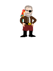 This features a cartoon character dressed as a pirate, standing with his arms crossed. He is wearing a brown outfit and has an eye patch on one of his eyes. A parrot can be seen perched on the pirate's shoulder, adding to the whimsical nature of the scene. The overall composition creates a playful and imaginative atmosphere.