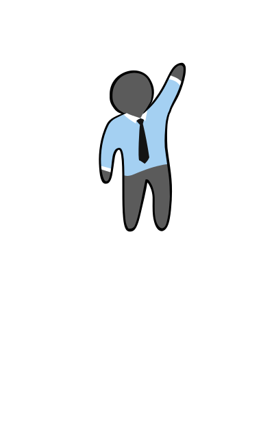 This features a cartoon man in a blue shirt and black tie, waving his hand upwards. He is standing on a white background that fills the majority of the frame. The man's outfit gives him a professional appearance, with the blue shirt and black tie adding to his polished look. His posture suggests confidence and friendliness as he greets the viewer.