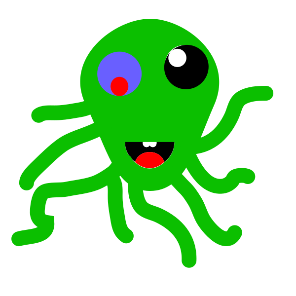 This features a cartoon-like green octopus with big eyes and a smile on its face. It has two blue dots for eyes, giving it a friendly appearance. The octopus is spreading its arms wide open, creating an impression of being happy or welcoming. This colorful character could be used in various contexts such as children's books, games, or educational materials to engage and entertain young audiences.