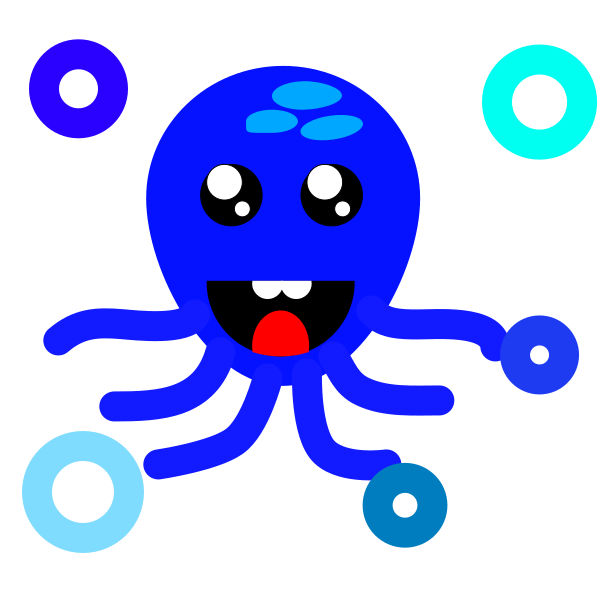 This features a blue cartoon octopus with a big smile on its face. It is surrounded by various circles, which are likely part of the background or design elements in the image. The octopus appears to be the main focus and seems to be enjoying itself as it poses for the picture. This colorful and playful character could be used in children's books, games, or other creative projects that involve friendly sea creatures.