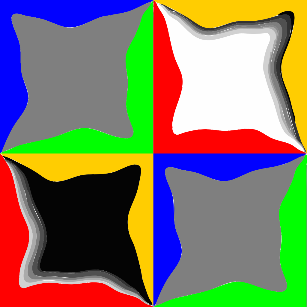 This is a colorful and abstract representation of four pillows. Each pillow has a different color, including red, blue, yellow, green, and white. These colors are combined in various patterns to create an interesting visual effect. The pillows appear to be stacked on top of each other, with the colors blending together to form a unique design. This artistic representation showcases the creativity behind combining different colors and textures to create a visually appealing piece.