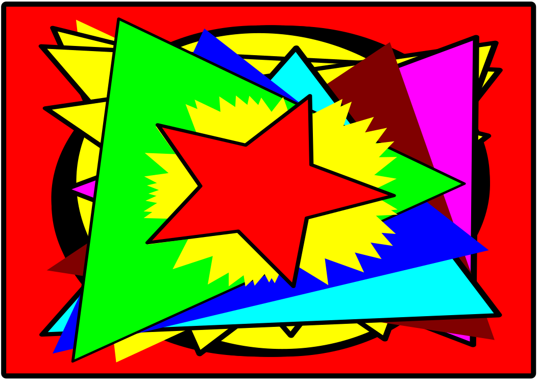 This features a colorful and vibrant design with a red star as the central focus. Surrounding the star are various triangles in different colors, creating an eye-catching pattern. The star is outlined with black, which contrasts nicely against the brightly colored background. This artistic display could be used for decoration or as part of a larger design project.