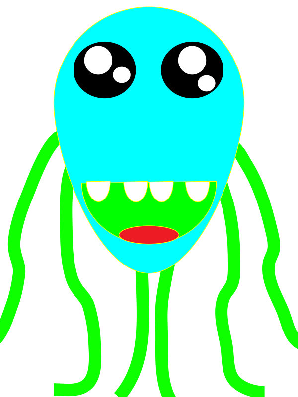 This features a cartoon-like creature with big green eyes and a blue body. It has a mouth that is open, showing its teeth in a wide smile. This character appears to be happy or playful, possibly from a children's book or an animated show. Its design resembles a monster or a friendly alien, making it an interesting and engaging visual for viewers of all ages.