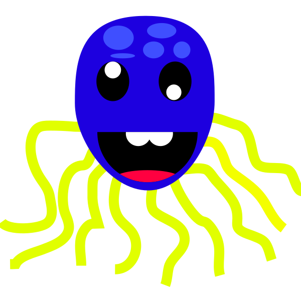 This features a blue and yellow cartoon octopus with a smiling face. It has nine long tentacles, each one varying in length and positioned around the body of the octopus. The octopus's facial expression is cheerful and friendly, making it an appealing character. Its design resembles that of a cute and playful creature, likely intended to entertain or amuse viewers.