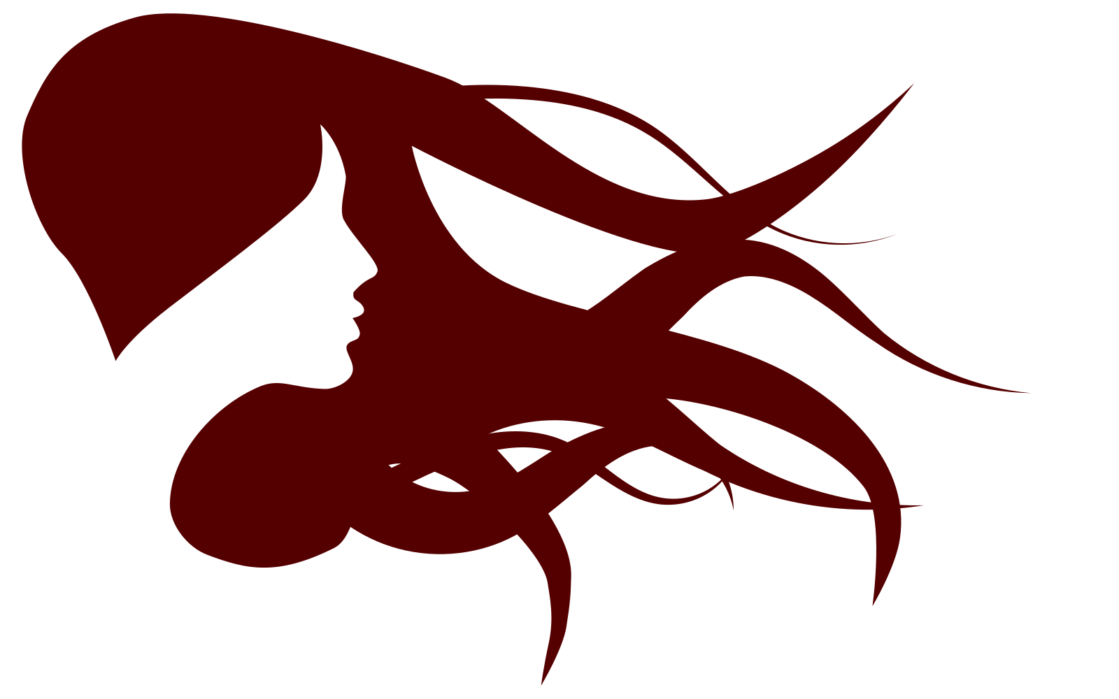 This features a silhouette of a woman with long brown hair. She appears to be looking towards the right, and her hair is blowing in the wind. The overall effect gives an impression of movement and gracefulness. The woman's face is prominently displayed, making it the focal point of the image.