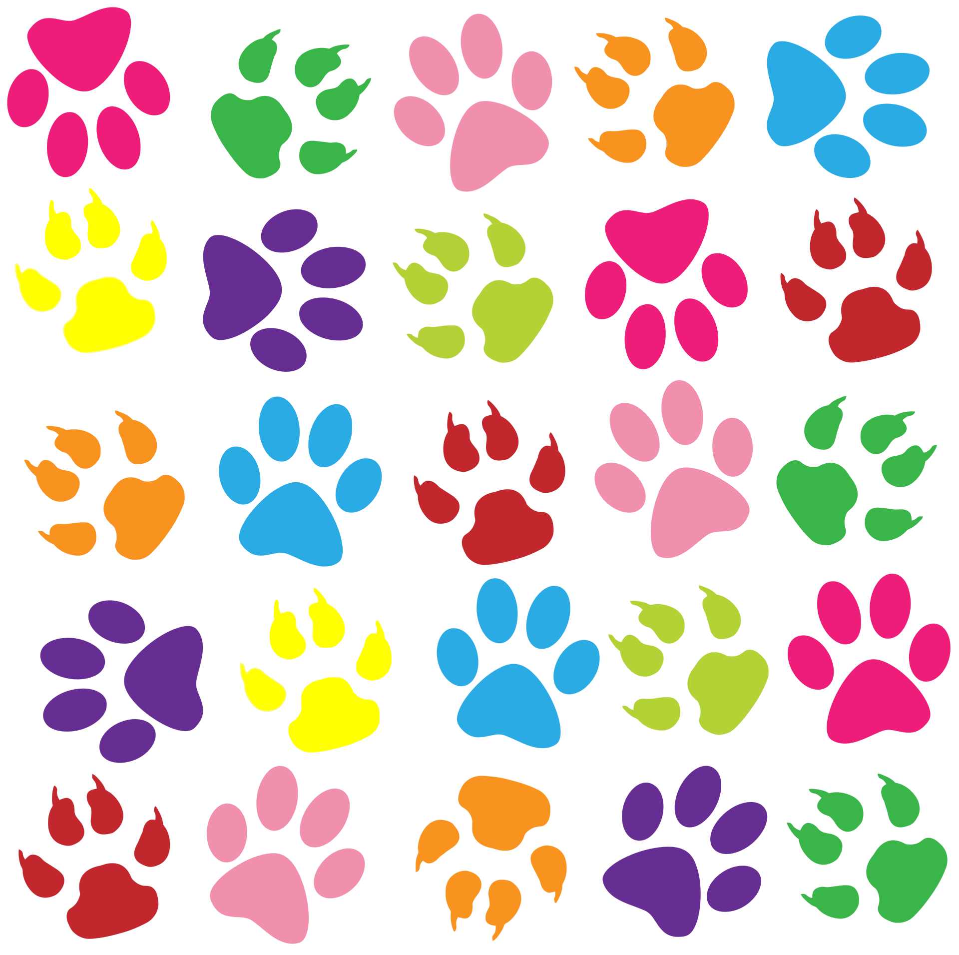 This features a white background with a pattern of colorful paw prints. There are numerous paw prints in various shapes and colors, creating an eye-catching design. Some of the paw prints have a yellow hue, while others are more vibrant shades like red or blue. The combination of these different colored paw prints creates a lively and playful atmosphere on the white background.