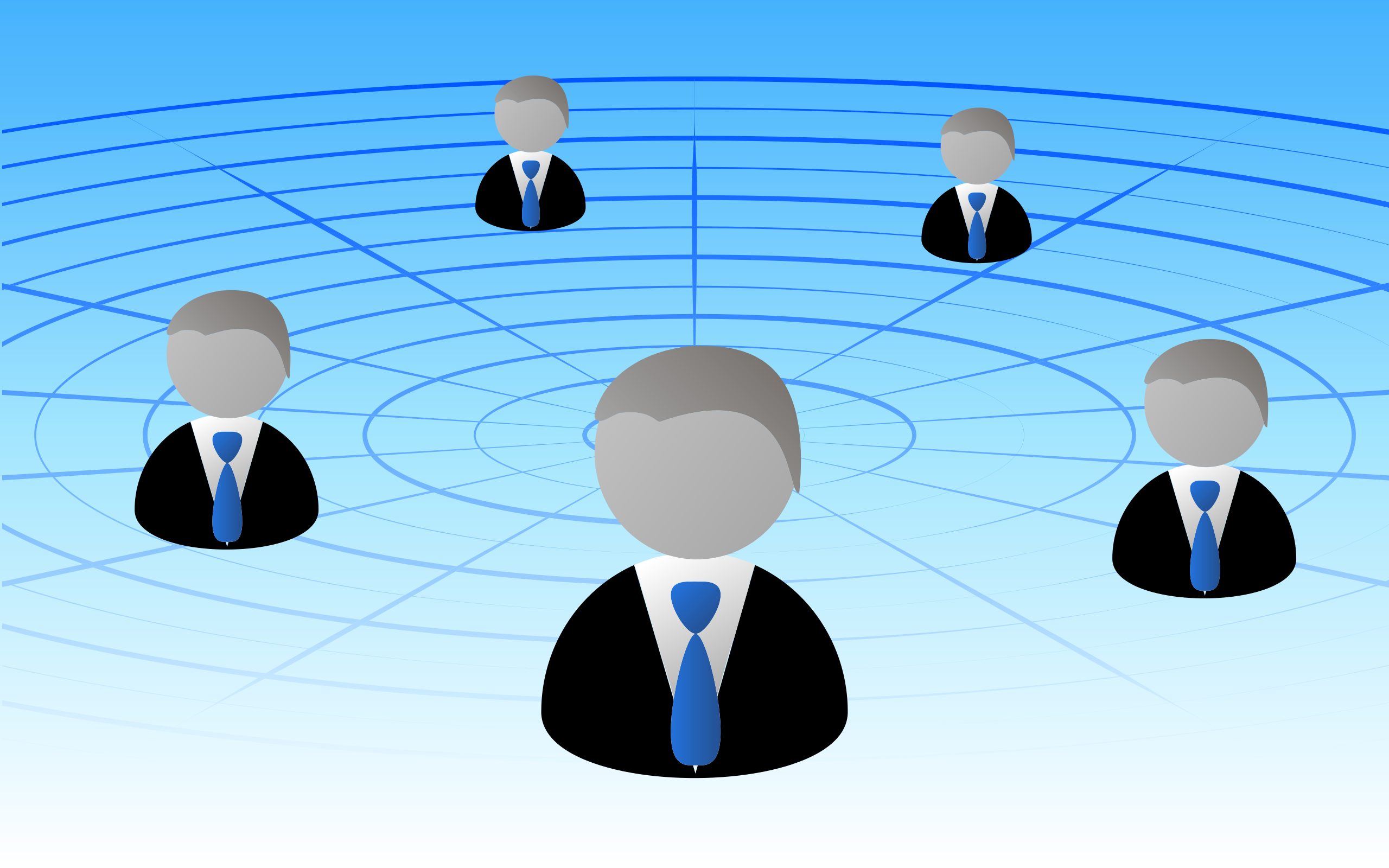This features a group of six businessmen, each wearing suits and ties. They are all standing in the center of a circle, which is surrounded by a blue background. Each man appears to be looking at something or someone else within the circle, creating an atmosphere of collaboration or discussion among them. Their attire suggests that they might be colleagues or business partners engaged in a professional setting. The overall composition of the image gives off a sense of unity and shared purpose among these individuals.