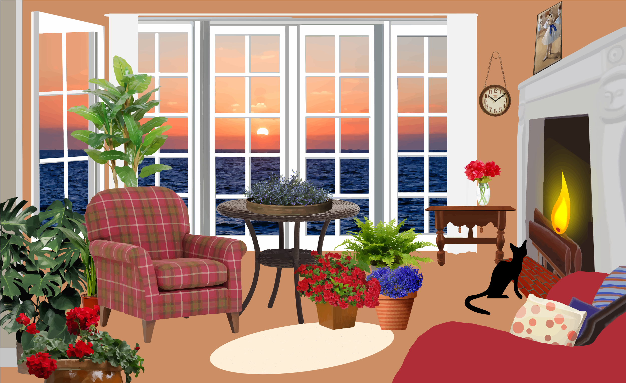 Tags: cat, fictional, fireplace, furniture, living room, room living