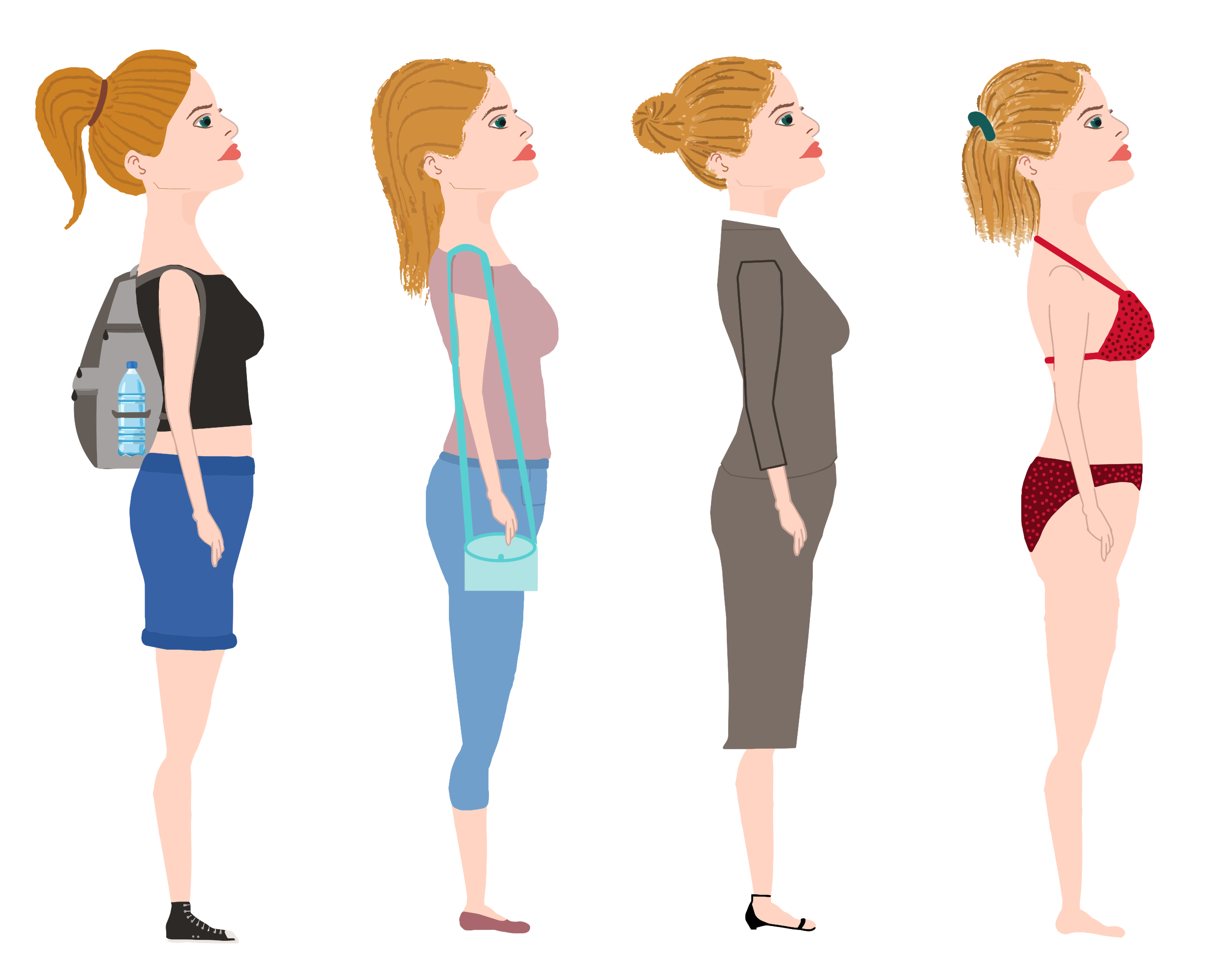 This features a series of five women standing next to each other, all wearing different outfits. They are positioned in a row, with the first woman on the left side and the last one on the right side. Each woman is holding a handbag, which can be seen clearly in their hands. The first woman is dressed in a black shirt and blue shorts, while the second woman has a pink top and jeans. The third woman is wearing a brown dress, and the fourth one is dressed in a red bikini. Lastly, the fifth woman is wearing a white shirt and carrying a backpack. Each of these women appears to be unique and distinct from each other, showcasing their individual styles and preferences.