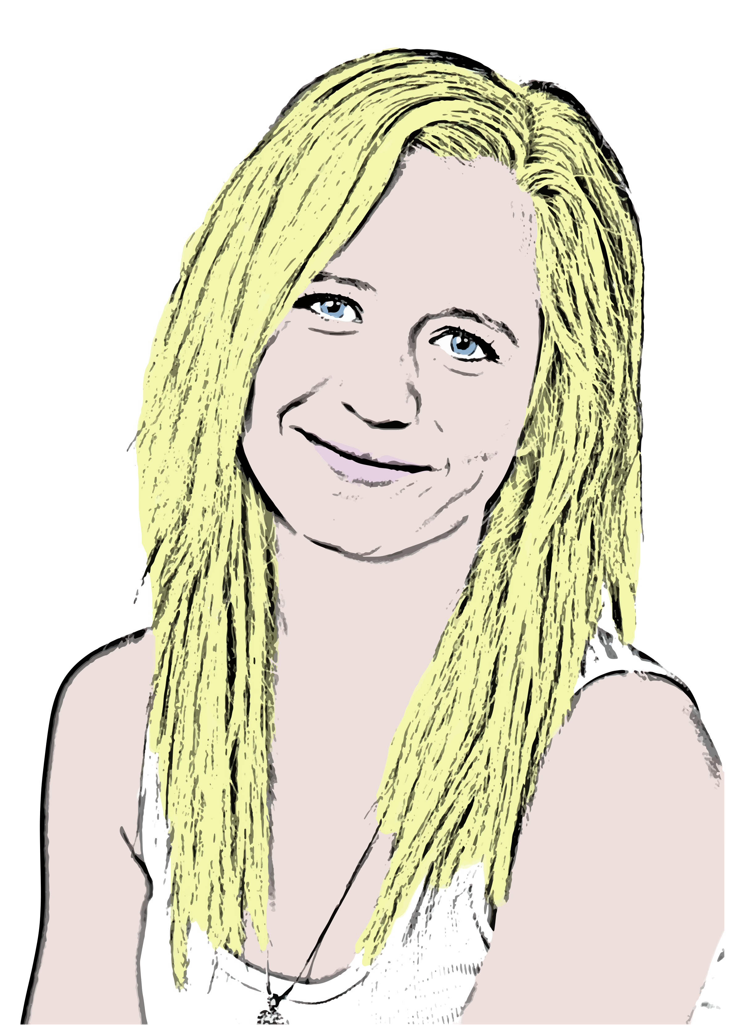 This features a woman with long blonde hair, wearing a white shirt. She is smiling and posing for the camera. Her hair appears to be in a ponytail or braid, adding to her overall appearance. The woman's smile seems genuine and friendly, making her an attractive subject for the photo.