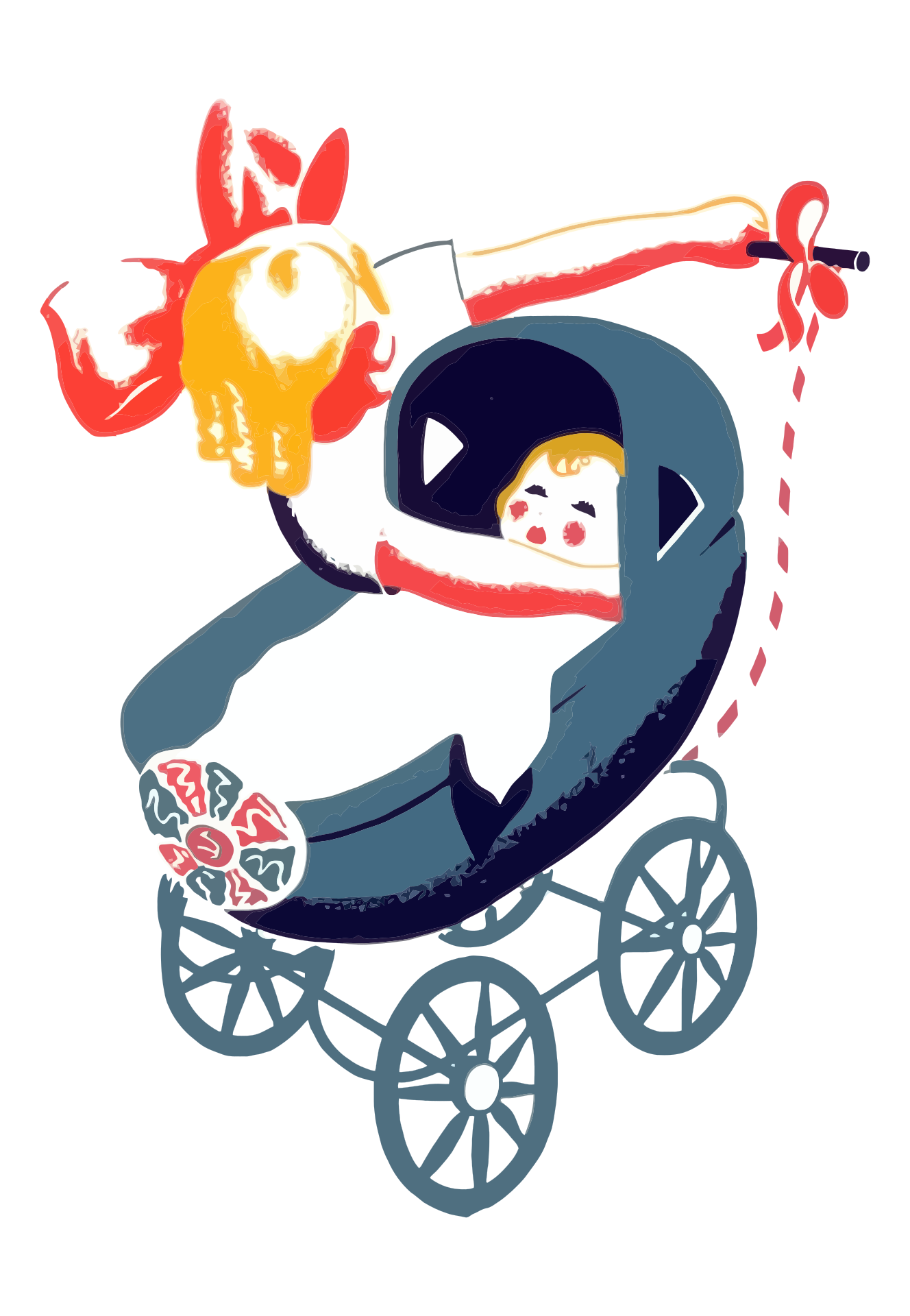 This features a colorful illustration of a woman holding a baby in a stroller. She is wearing a red shirt and appears to be enjoying her time with the child. In addition to the main characters, there are two teddy bears present in the scene - one on the left side and another on the right side. The illustration has a whimsical and playful vibe, making it an appealing visual for children or those who appreciate creative artwork.