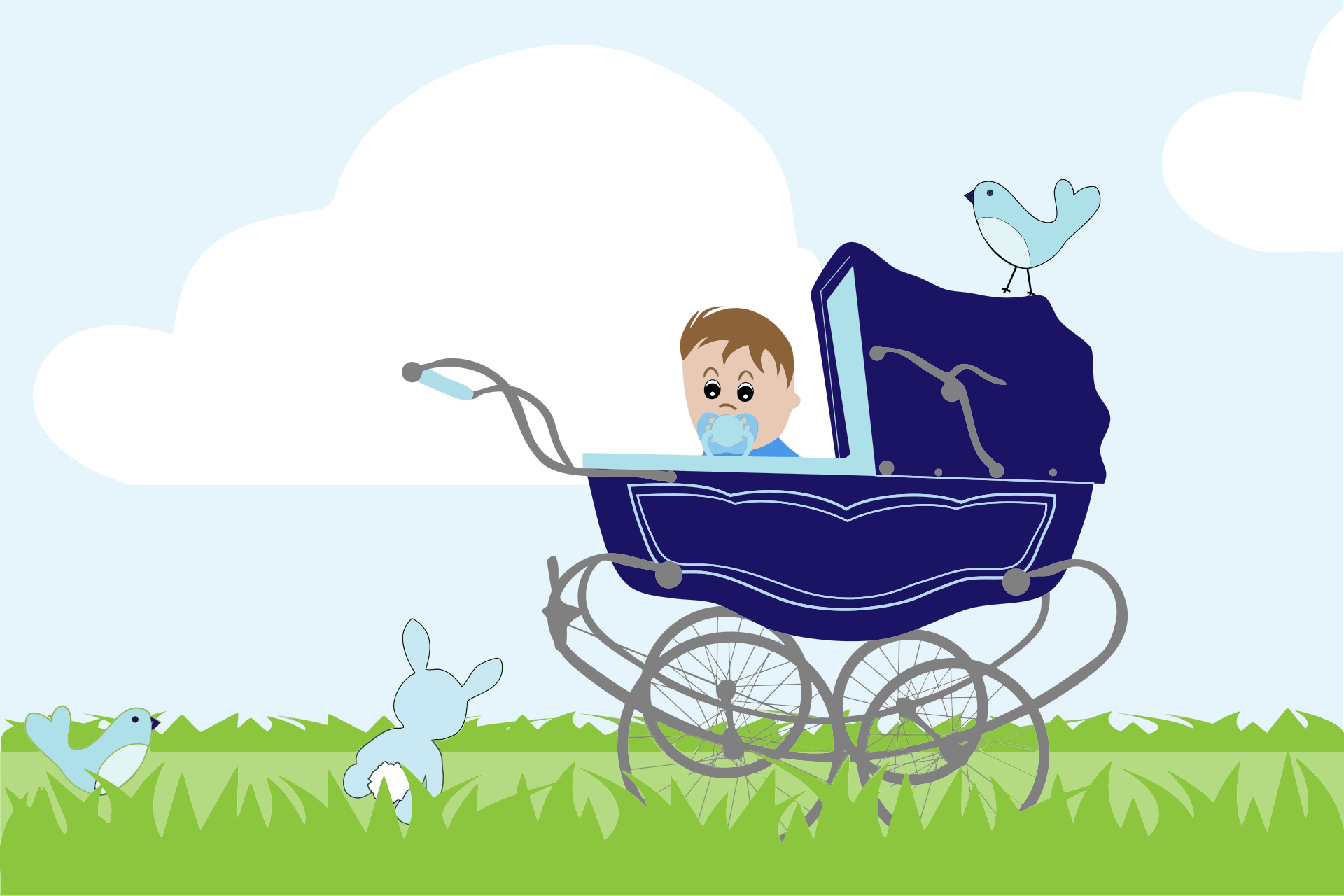 Tags: baby, bird, boy, carriage, field, grass, male, pram, stroller, cartoon, cloud