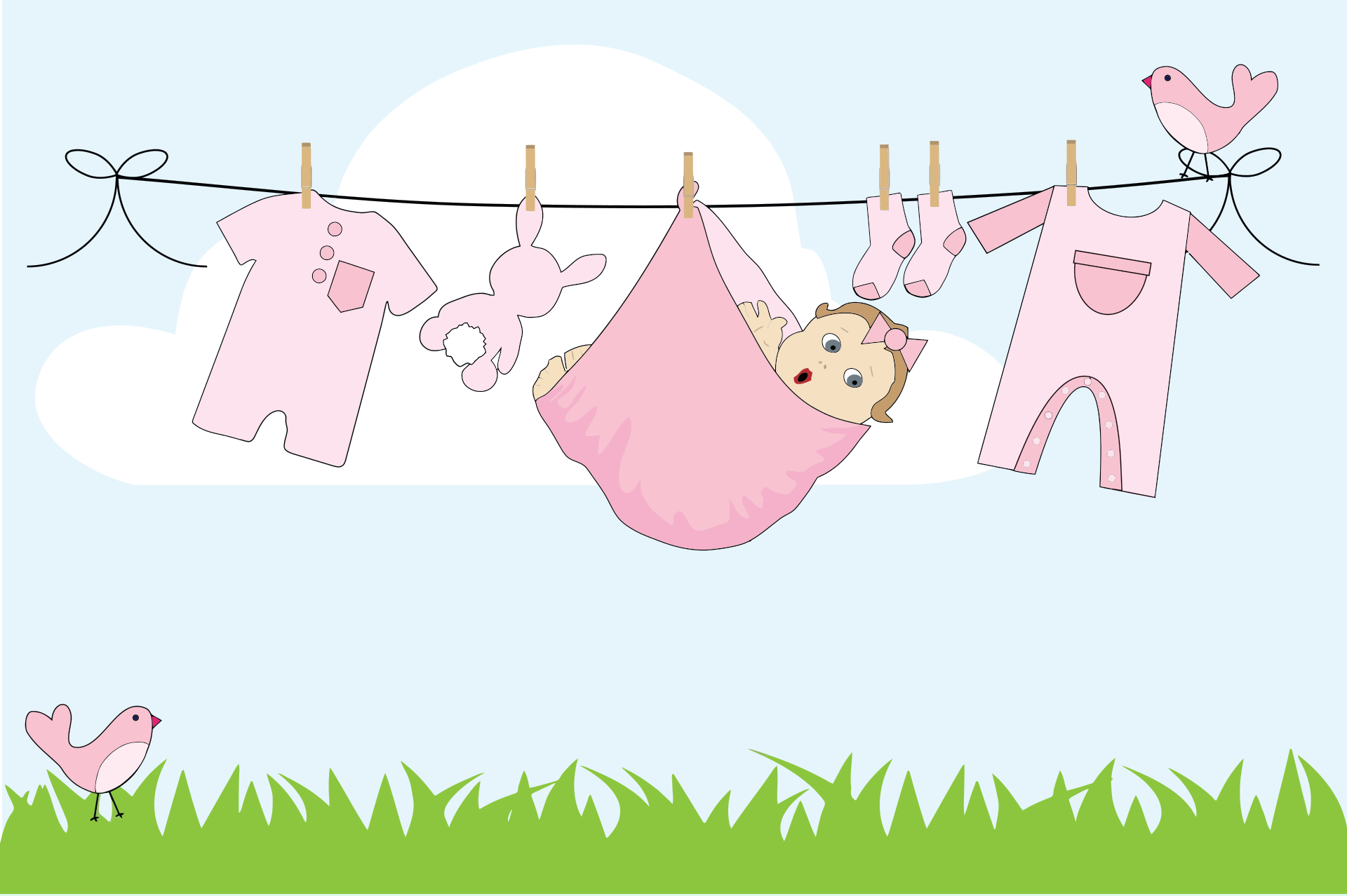 This features a baby girl in a pink blanket, hanging from the clothesline. She appears to be surprised as she is suspended above the grassy area. There are several other pink clothing items on the clothesline, including shirts and dresses. In addition to the baby girl, there are two birds present in the scene, one near the bottom left corner of the image and another towards the top right corner. The overall atmosphere is playful and charming, with a focus on the adorable baby girl hanging from the clothesline.