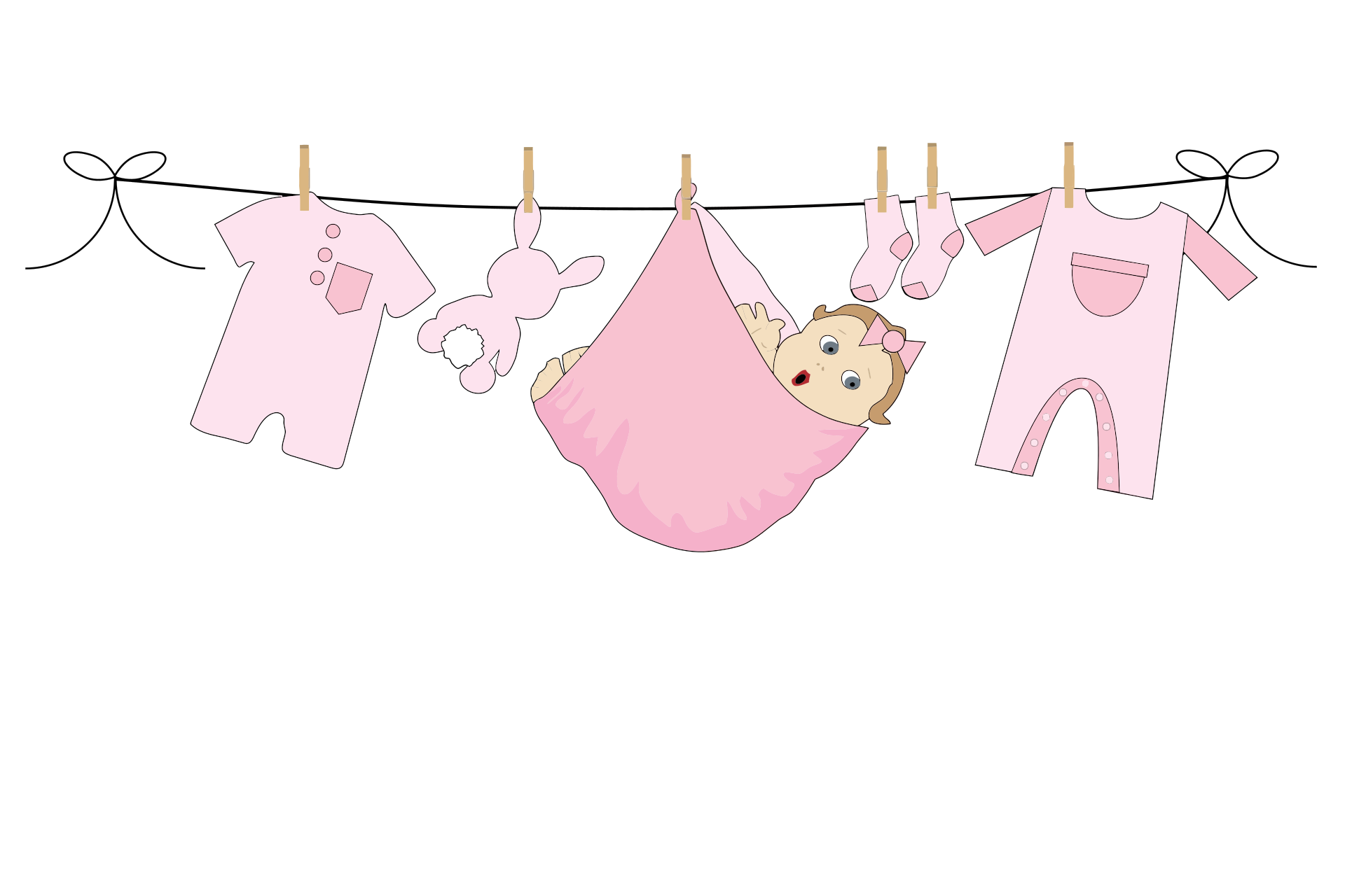 This features a baby girl in a pink blanket, hanging on the clothesline. She appears to be surprised as she is being hung out to dry. There are several other pieces of clothing on the line, all in shades of pink. These items include various sizes and styles of clothing, creating an adorable scene for anyone who sees it. The baby girl's positioning and the surrounding clothes suggest a playful and lighthearted atmosphere.
