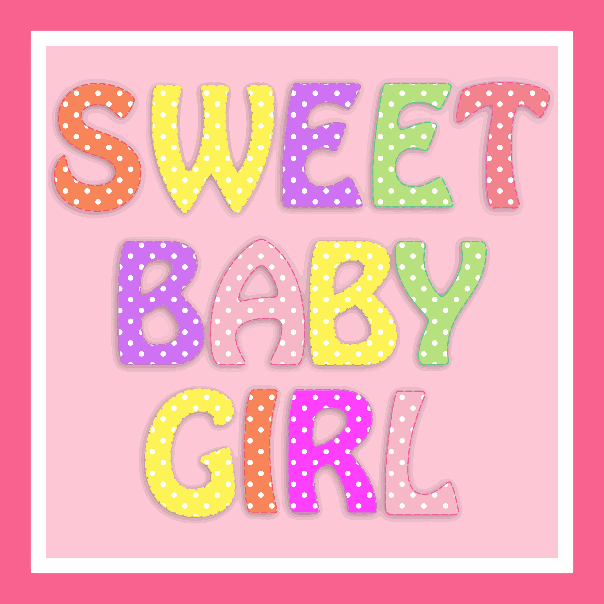 This features a pink background with the words "Sweet Baby Girl" written in bright colors, including yellow, green, and purple. These vibrant letters are scattered across the background, creating an eye-catching display. The combination of the pink background and the colorful text creates a cheerful and playful atmosphere that is perfect for showcasing baby-related items or themes.