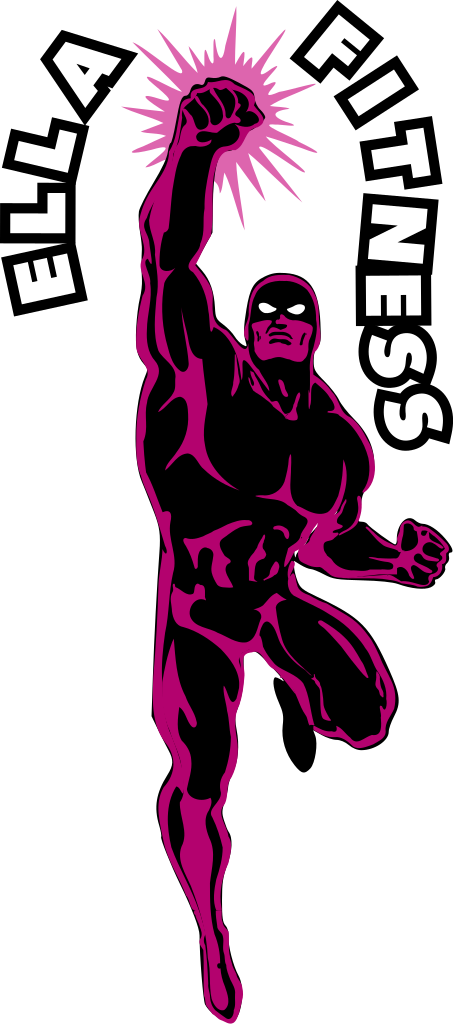 This features a man in a black and red costume, with the words "Ella Fitness" written on his chest. He is holding up a pink lightning bolt, giving off an energetic vibe. The man appears to be flying through the air, showcasing his strength and fitness. This poster could be used as a motivational tool for those looking to improve their physical health or fitness levels.