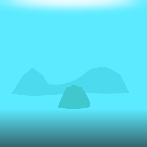 This features a beautiful blue ocean with two small islands in the distance. One island is located towards the left side of the scene, while the other is situated more towards the right. The sky above these islands appears to be cloudy and hazy, creating an atmospheric backdrop for the serene landscape. The overall effect is a peaceful and picturesque view of the ocean with its two small islands in the distance.