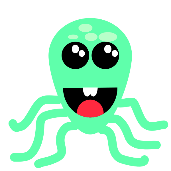 This features a cartoon-like octopus with big eyes and a smile on its face. It has long tentacles that extend outwards, giving it a playful appearance. The octopus is colored in shades of green and red, adding to the vibrant nature of the character. Its facial expression appears friendly and inviting, making it an appealing image for children or anyone who enjoys cartoons.