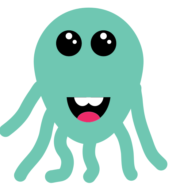This features a cute and colorful cartoon octopus with big eyes, a smile on its face, and two small dots for pupils. It has long tentacles that extend from the top of its head to the bottom of the frame. The octopus is positioned in the center of the image, occupying most of the space. Its cheerful expression and unique design make it an appealing and playful character.