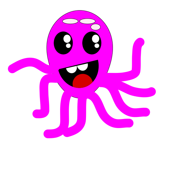This features a cartoonish drawing of an octopus with a pink body and purple tentacles. It has big eyes, a smile on its face, and is holding up one of its arms in the air. The octopus's facial expression appears to be happy and friendly, making it look like a character from a children's cartoon or comic book. The drawing is likely meant to evoke feelings of joy and playfulness, as well as to entertain viewers with its whimsical appearance.