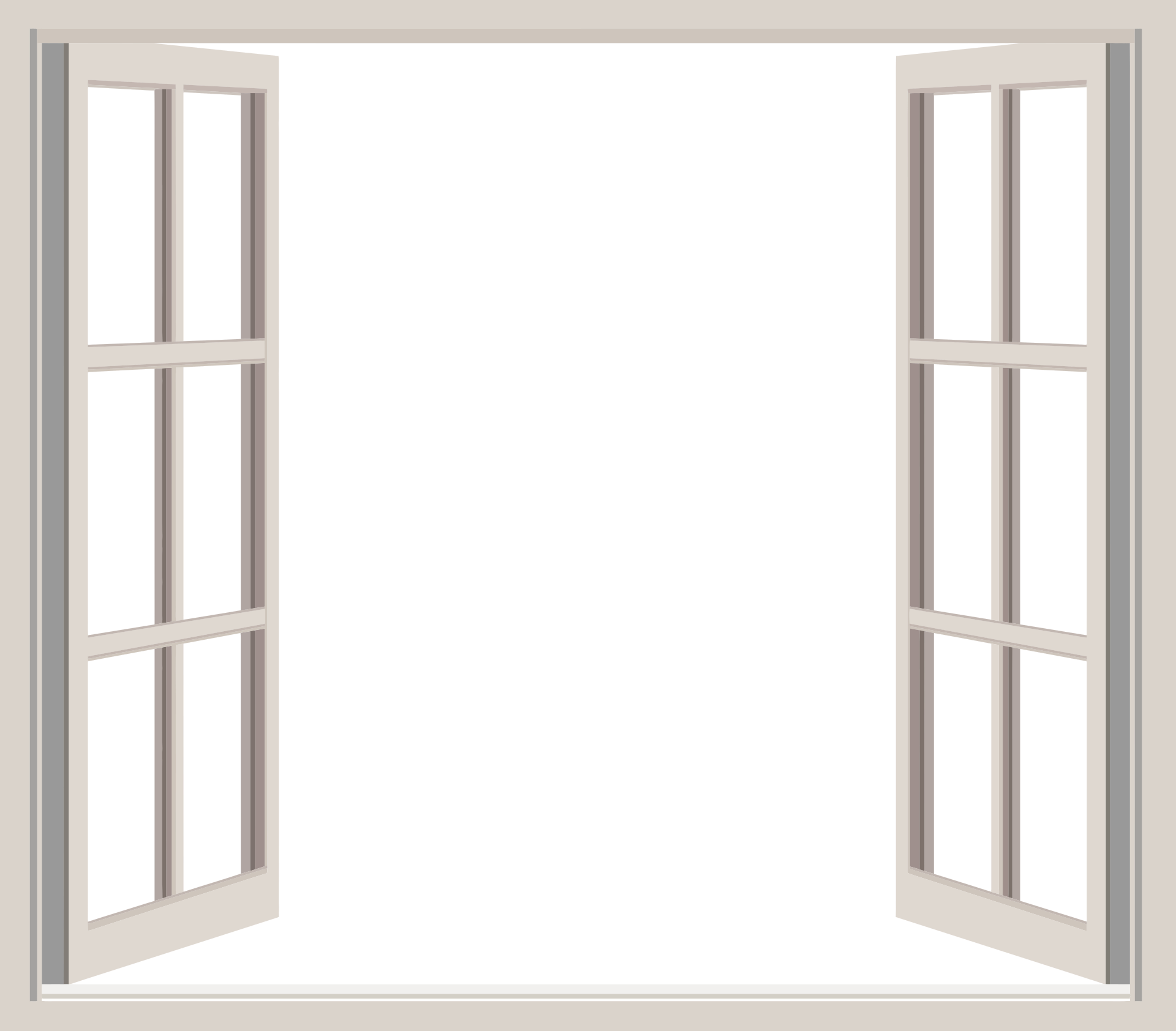 This features a large window with two panes of glass, each pane being slightly open. The window is situated in the middle of a wall and appears to be empty, giving it an unoccupied look. The frame surrounding the window is white, which adds to its simplicity and clean appearance. The overall scene gives off a sense of tranquility and calmness, as if one could easily imagine themselves sitting by the window with nothing but the view outside to keep them company.
