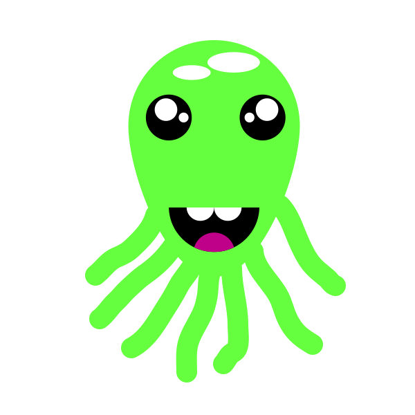 This features a green cartoon octopus with big eyes and a smile on its face. It appears to be happy, possibly due to the fact that it is smiling at the viewer. The octopus has a large head and several tentacles extending from it. Its design gives off a friendly and playful vibe, making it an appealing character for children or anyone who enjoys cute cartoons.