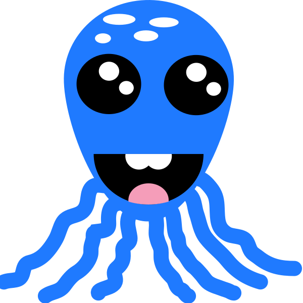 This features a blue cartoon octopus with big eyes and a smile on its face. It appears to be happy, possibly due to the fact that it is smiling at the viewer. The octopus has a long tentacle extending from its body, adding to its unique appearance. This whimsical character could be used in various contexts such as children's books or educational materials, where it would likely serve as an engaging and entertaining mascot.