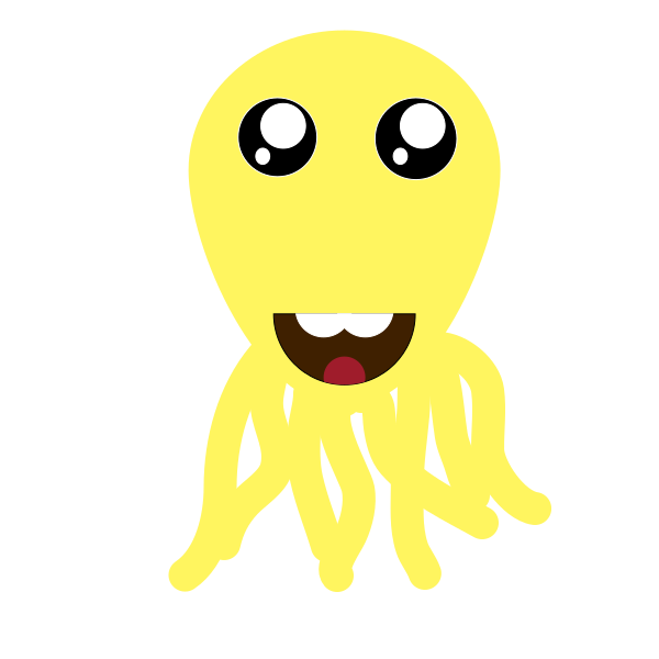 This features a yellow cartoon octopus with big eyes and a smile on its face. It appears to be happy, possibly due to the fact that it is smiling at the camera. The octopus has long tentacles extending from its body, giving it a unique and playful appearance. Its large eyes are situated close together, adding to the character of the cartoon creature. Overall, this image captures a cheerful and friendly representation of an octopus.