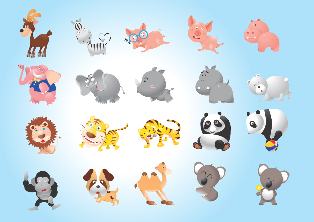 This features a collection of various animal icons arranged in four rows on a blue background. Each row contains five different animals, showcasing their unique poses and appearances. Among the diverse group of animals are a deer, zebra, pig, cat, hippo, elephant, rhino, polar bear, lion, tiger, panda, gorilla, dog, camel, and koala. The arrangement creates an appealing visual display that highlights the unique characteristics of each animal.