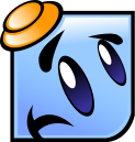 This features a blue square with two round edges and two straight edges, resembling a smiley face. This character is wearing an orange hat on its head, giving it a playful appearance. However, the smiley face has a worried expression on its face, which adds a touch of emotion to the image. The blue square's design creates a unique and interesting visual that captures attention and evokes feelings of curiosity or amusement.