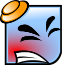 This features a blue smiley face with red cheeks, giving it an angry appearance. It is wearing a yellow hat on its head, adding to the playful and quirky nature of the character. The smiley's facial expression appears to be quite intense, making it stand out as a unique and eye-catching design element in the image.